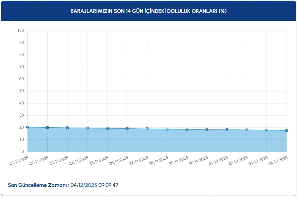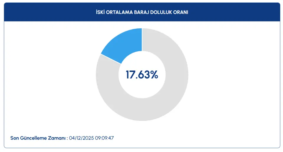 İSKİ tarafından 04.12.2025 tarihinde saat 09.09'da paylaşılan verilere göre, İSKİ ortalama baraj doluluk oranı %17,63