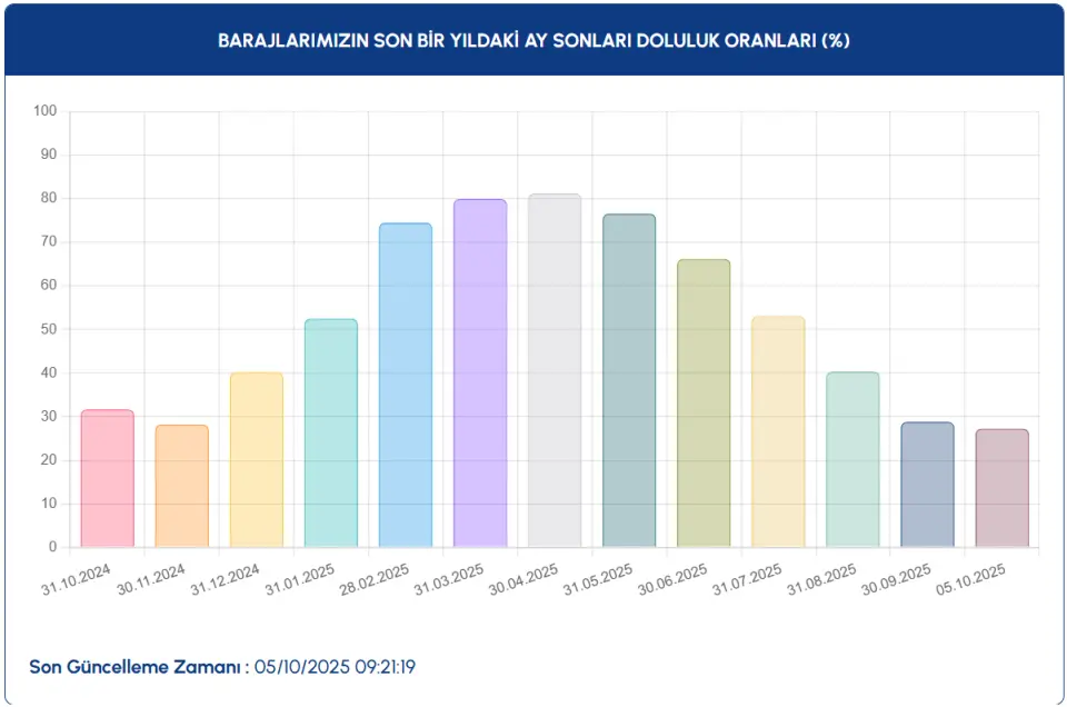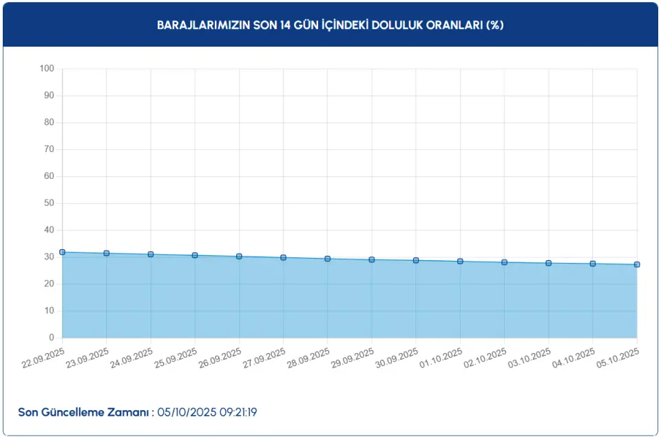 Böylece 5 Ekim 2025 tarihinde İstanbul Su ve Kanalizasyon İdaresi (İSKİ) tarafından açıklanan verilere göre ortalama baraj doluluk oranı %27.28 olarak açıklandı.