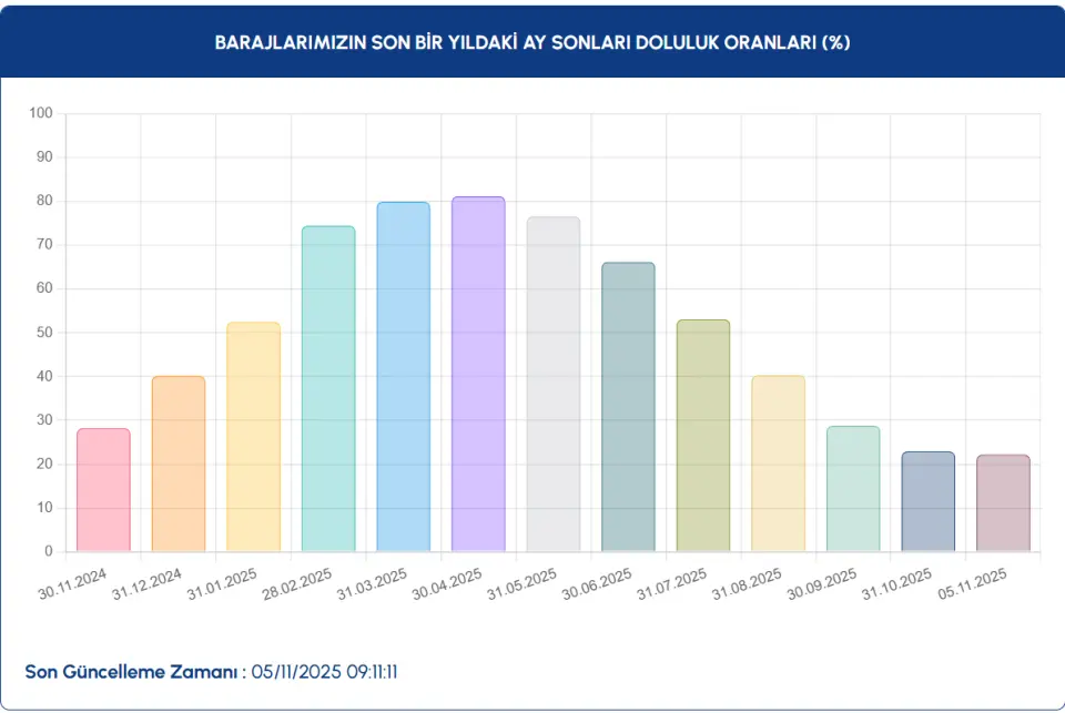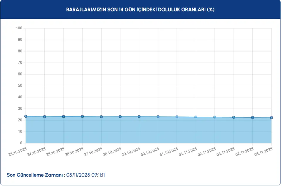 Böylece 5 Kasım 2025 tarihinde İstanbul Su ve Kanalizasyon İdaresi (İSKİ) tarafından açıklanan verilere göre ortalama baraj doluluk oranı %22.24 olarak açıklandı.