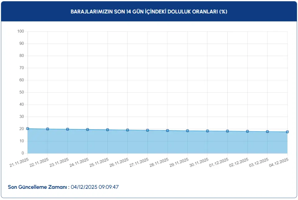 Böylece 5 Aralık 2025 tarihinde İstanbul Su ve Kanalizasyon İdaresi (İSKİ) tarafından açıklanan verilere göre ortalama baraj doluluk oranı %17,39 olarak açıklandı.