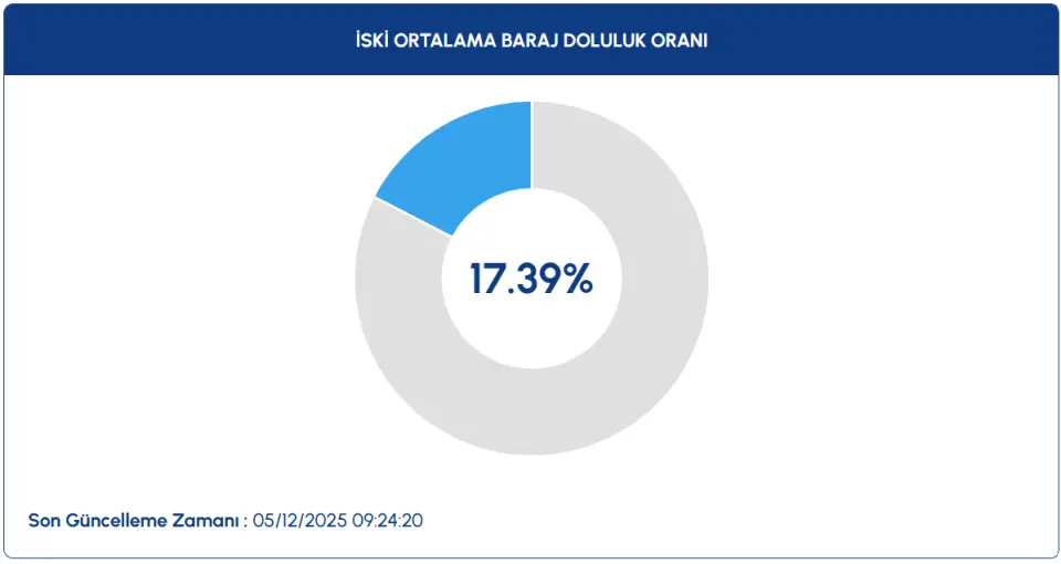 İSKİ tarafından 05.12.2025 tarihinde saat 09.24'te paylaşılan verilere göre, İSKİ ortalama baraj doluluk oranı %17,39