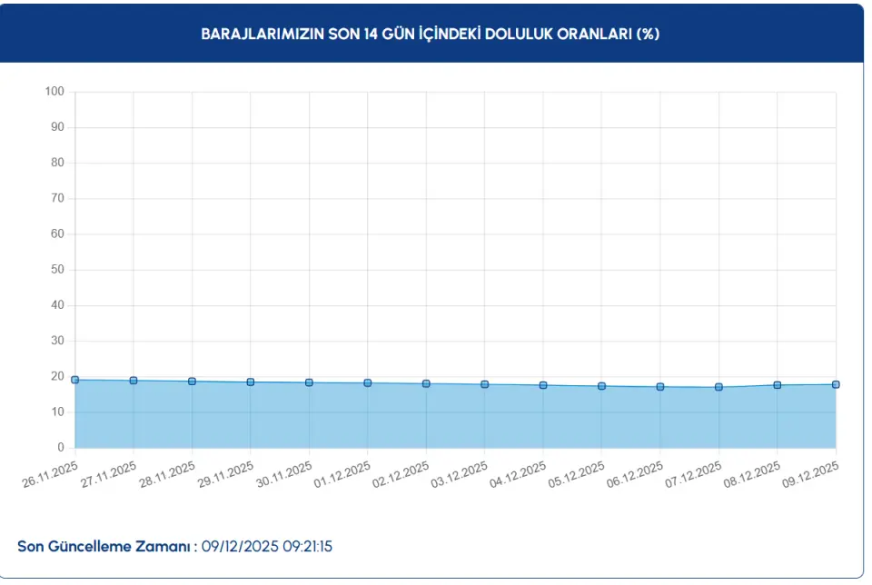 Böylece 9 Aralık 2025 tarihinde İstanbul Su ve Kanalizasyon İdaresi (İSKİ) tarafından açıklanan verilere göre ortalama baraj doluluk oranı %17,81 olarak açıklandı.