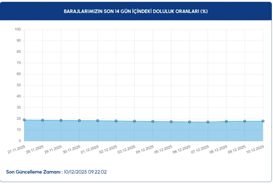 Böylece 10 Aralık 2025 tarihinde İstanbul Su ve Kanalizasyon İdaresi (İSKİ) tarafından açıklanan verilere göre ortalama baraj doluluk oranı %17,91 olarak açıklandı.