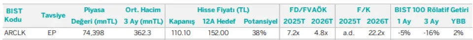 ARCLK için verilen hedef fiyat 152 TL. Hisse 2024 yılında 190 TL zirve fiyattan düşüşe geçmişti. Bu günlerde 110 TL civarı fiyatlarda olan hisse için endek üzeri getiri potansiyeli tespit edildi.