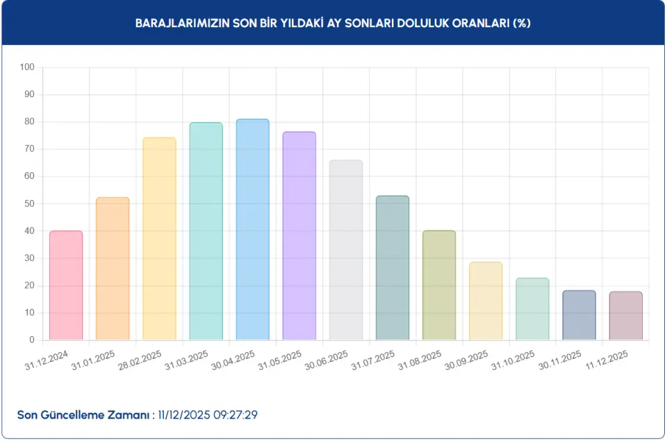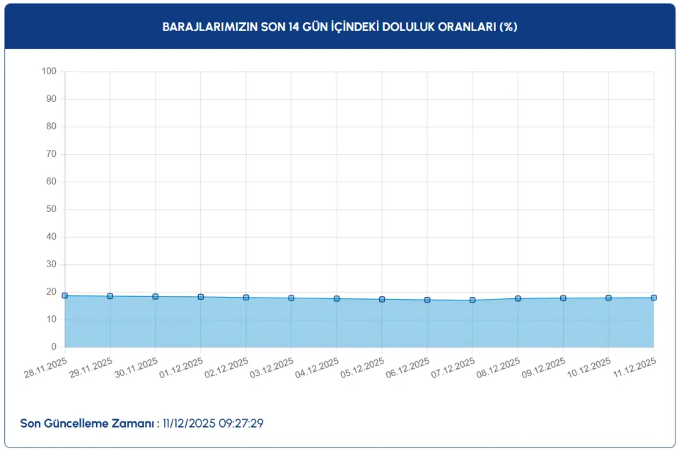 Böylece 11 Aralık 2025 tarihinde İstanbul Su ve Kanalizasyon İdaresi (İSKİ) tarafından açıklanan verilere göre ortalama baraj doluluk oranı %17,95 olarak açıklandı.