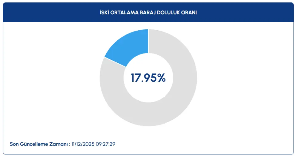 İSKİ tarafından 11.12.2025 tarihinde saat 09.27'de paylaşılan verilere göre, İSKİ ortalama baraj doluluk oranı %17,95