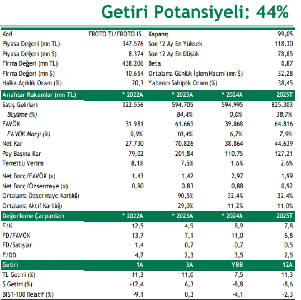 ➢ Şirket için hedef pay fiyatımız olan 143 ,00 TL’yi ve “AL” tavsiyemizi koruyoruz . 30 Eylül 2025 kapanışı baz alınarak Ford Otosan, 2025 T 6 . 8 x FD/FAVÖK ve 2025 T F/K 7 . 8 x rasyoları ile işlem görmekte olup getiri potansiyeli %44’e işaret etmektedir .