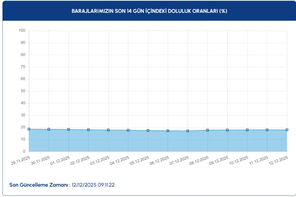 Böylece 12 Aralık 2025 tarihinde İstanbul Su ve Kanalizasyon İdaresi (İSKİ) tarafından açıklanan verilere göre ortalama baraj doluluk oranı %17,97 olarak açıklandı.