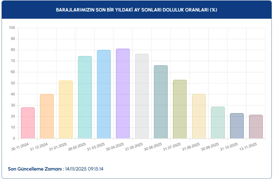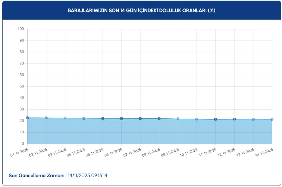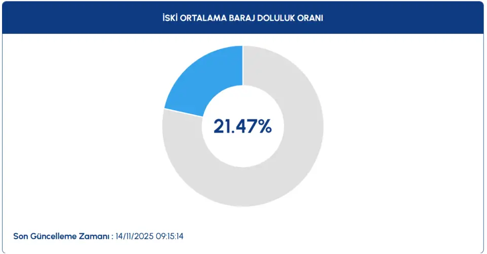 İSKİ tarafından 14.11.2025 tarihinde saat 09.15'te paylaşılan verilere göre, İSKİ ortalama baraj doluluk oranı %21.47