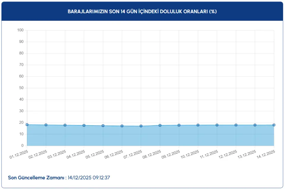 Böylece 14 Aralık 2025 tarihinde İstanbul Su ve Kanalizasyon İdaresi (İSKİ) tarafından açıklanan verilere göre ortalama baraj doluluk oranı %17,98 olarak açıklandı.