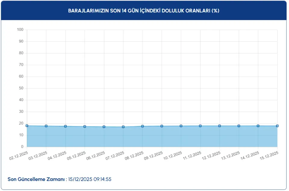 Böylece 15 Aralık 2025 tarihinde İstanbul Su ve Kanalizasyon İdaresi (İSKİ) tarafından açıklanan verilere göre ortalama baraj doluluk oranı %17,93 olarak açıklandı.