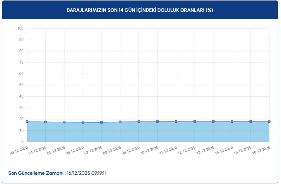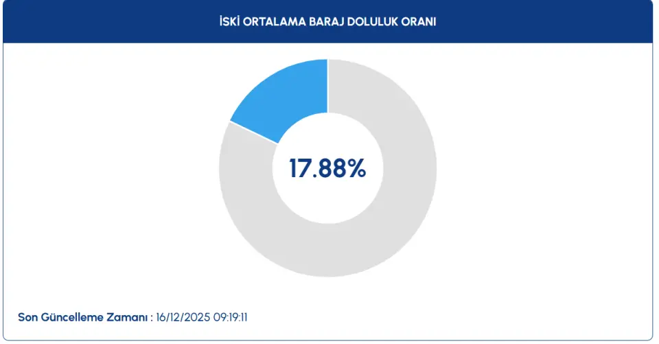 İSKİ tarafından 16.12.2025 tarihinde saat 09.19'da paylaşılan verilere göre, İSKİ ortalama baraj doluluk oranı %17,88