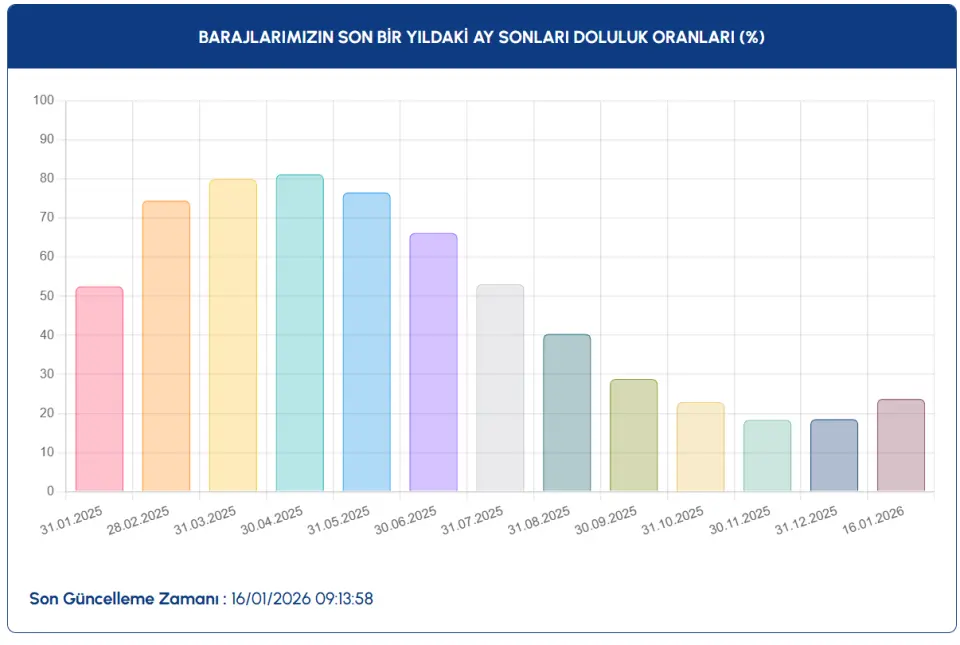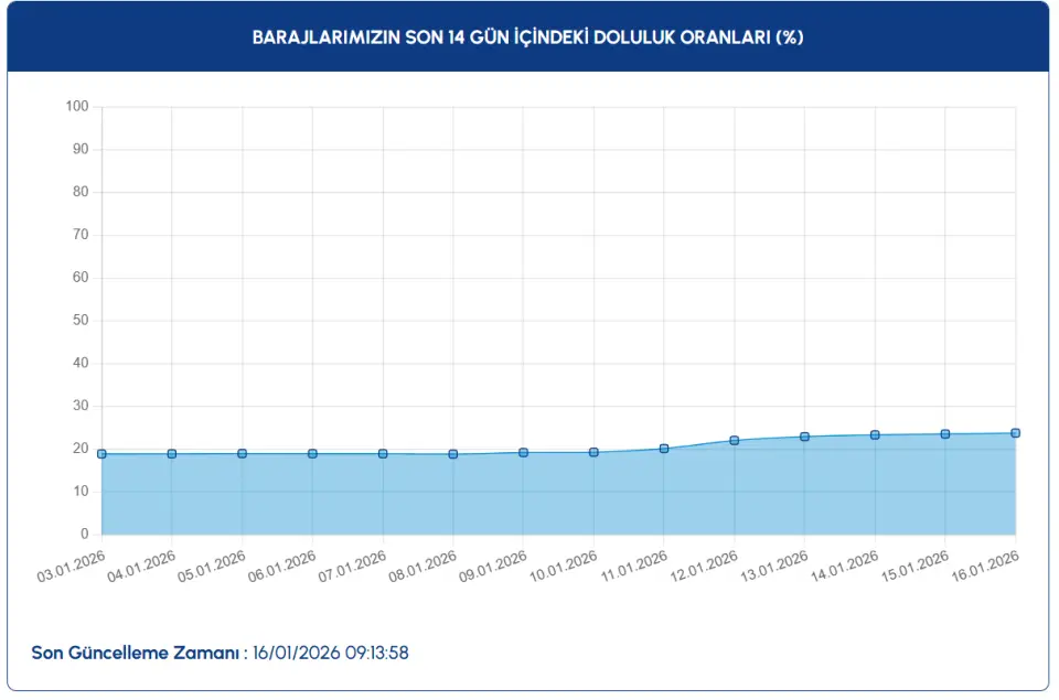İSKİ tarafından 16.01.2026 tarihinde saat 09.13'te paylaşılan verilere göre, İSKİ ortalama baraj doluluk oranı %23.75