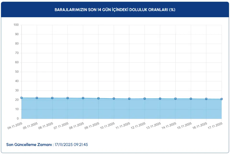 Böylece 17 Kasım 2025 tarihinde İstanbul Su ve Kanalizasyon İdaresi (İSKİ) tarafından açıklanan verilere göre ortalama baraj doluluk oranı %21.08 olarak açıklandı.