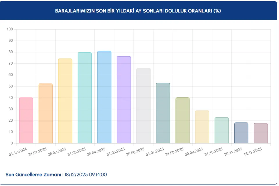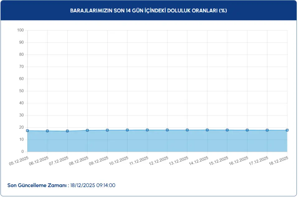 Böylece 18 Aralık 2025 tarihinde İstanbul Su ve Kanalizasyon İdaresi (İSKİ) tarafından açıklanan verilere göre ortalama baraj doluluk oranı %17,8 olarak açıklandı.