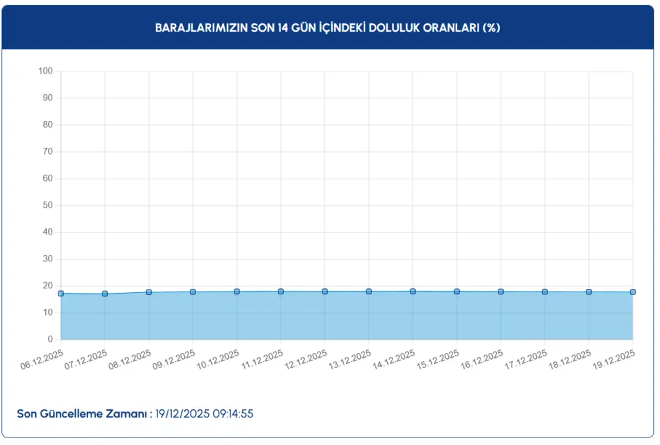 Böylece 19 Aralık 2025 tarihinde İstanbul Su ve Kanalizasyon İdaresi (İSKİ) tarafından açıklanan verilere göre ortalama baraj doluluk oranı %17,76 olarak açıklandı.