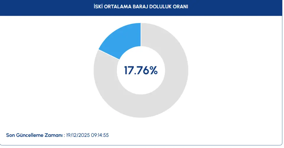 İSKİ tarafından 19.12.2025 tarihinde saat 09.14'te paylaşılan verilere göre, İSKİ ortalama baraj doluluk oranı %17,76