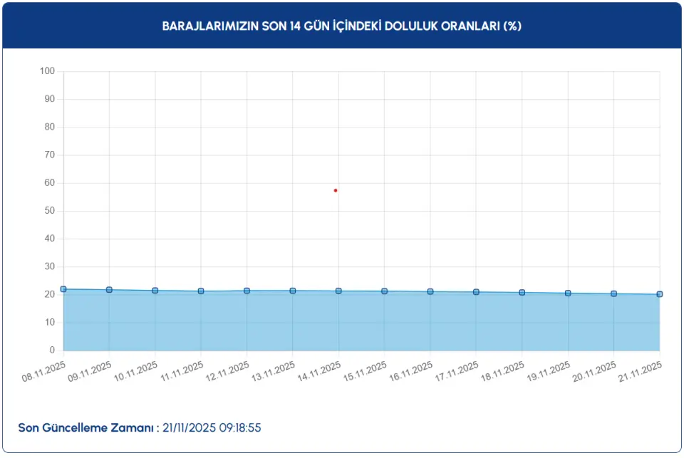 İSKİ tarafından 21.11.2025 tarihinde saat 09.18'de paylaşılan verilere göre, İSKİ ortalama baraj doluluk oranı %20.29