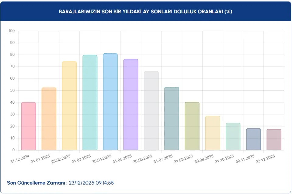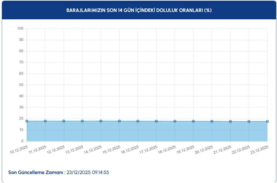 İSKİ tarafından 23.12.2025 tarihinde saat 09.14'te paylaşılan verilere göre, İSKİ ortalama baraj doluluk oranı %17.62