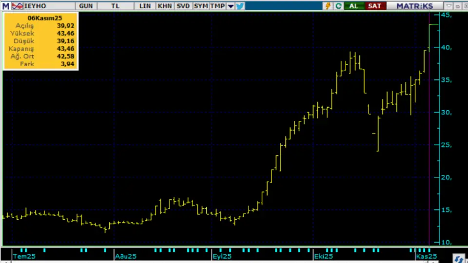 IEYHO 21 Ekim günü 24 TL fiyattan hızlıca yükselişe geçti. O gün derin bir marj yapan hisse, sonraki günlerde de kararlı alıcılarla primlenmeye devam etti, Hisse, 43,46 TL zirve fiyata kadar primlendi. Ancak bu hızlı hareket Borsa İstanbul yönetimini harekete geçirdi. Hissedeki agresif hareketlerden küçük yatırımcıyı korum amacıyla hissede kredili işlemler ve açığa satış 1 ay süreyle yasaklandı.