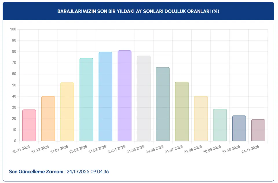 Böylece 24 Kasım 2025 tarihinde İstanbul Su ve Kanalizasyon İdaresi (İSKİ) tarafından açıklanan verilere göre ortalama baraj doluluk oranı %19,57 olarak açıklandı.