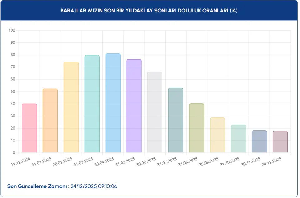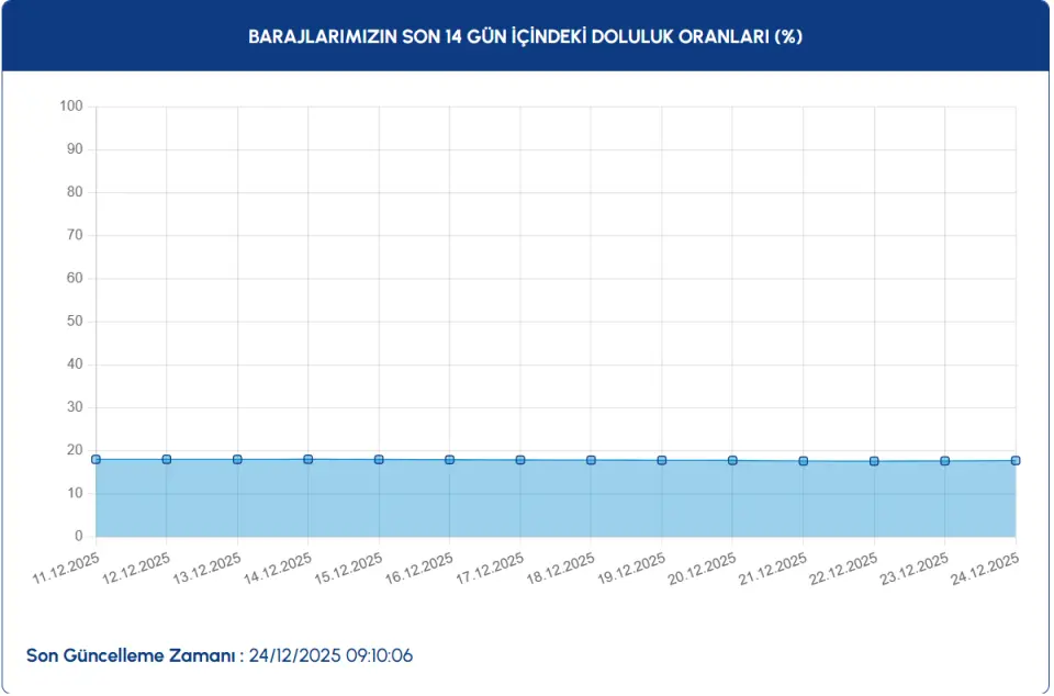 İSKİ tarafından 24.12.2025 tarihinde saat 09.10'da paylaşılan verilere göre, İSKİ ortalama baraj doluluk oranı %17.7