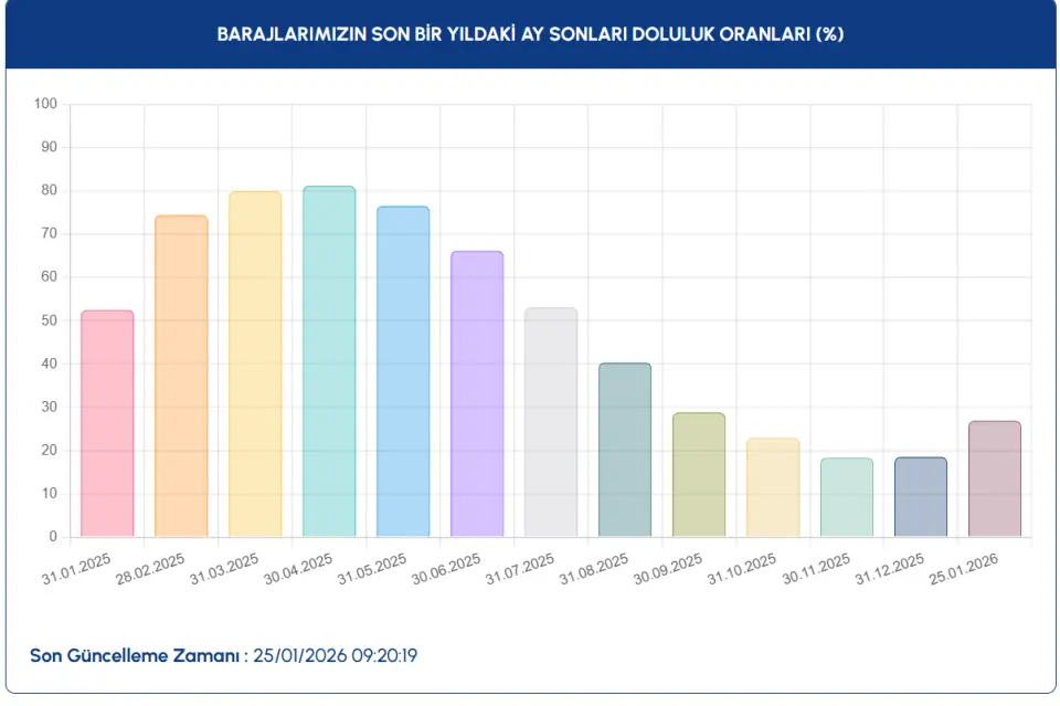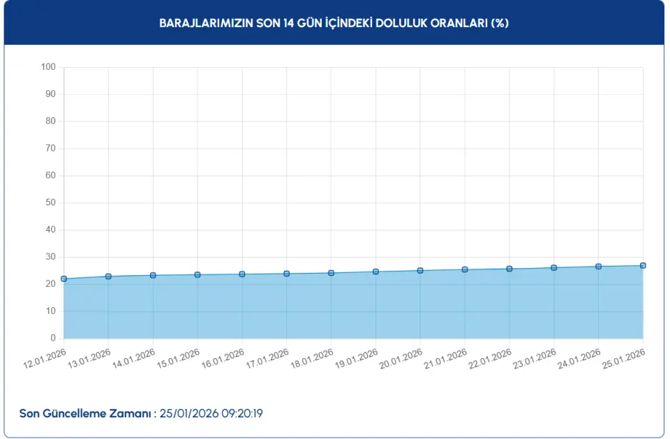 Böylece 25 Ocak 2026 tarihinde İstanbul Su ve Kanalizasyon İdaresi (İSKİ) tarafından açıklanan verilere göre ortalama baraj doluluk oranı %26.91 olarak açıklandı.