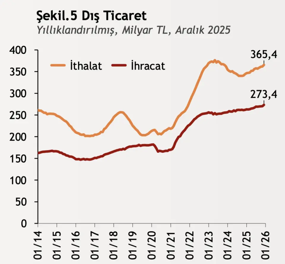 TÜİK verilerine göre, Aralık 2025'te ihracat %12,7 artışla 26,4 milyar dolar, ithalat %10,7 artışla 35,7 milyar dolar gerçekleşti. Enerji ve altın hariç ihracat %14,6, ithalat %17,9 artış gösterdi. Yıllık bazda incelendiğinde; ihracat %4,4 artarak 273,4 milyar dolar, ithalat %6,2 yükselerek 365,4 milyar dolar oldu; dış ticaret açığı %11,9 artışla 92 milyar dolara çıktı. İhracatın ithalatı karşılama oranı ise yıllık bazda %74,8'e geriledi. En fazla ihracat yapılan ülke Almanya olurken, en fazla ithalat yapılan ülke Çin oldu.