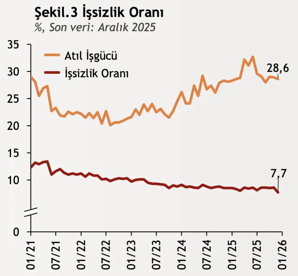 TÜİK verilerine göre Türkiye'de Aralık ayında işsizlik 0,8 puan düşerek %7,7'ye indi ve 2005'ten bu yana en düşük seviyeye ulaştı. İşsiz sayısı bir önceki aya göre 286 bin, geçen yıla göre 339 bin kişi azalarak 2 milyon 736 bin kişi oldu. 15 ve üstü yaş grubundaki işsiz sayısı bir önceki aya göre 286 bin kişi azalarak 2 milyon 736 bin kişi oldu. Erkeklerde oran %6,3, kadınlarda %10,5 olurken atıl işgücü Kasım'daki %29,1'den %28,6'ya düştü. İstihdam edilenlerin sayısı 42 bin azalsa da istihdam oranı %49,1'de sabit kaldı.