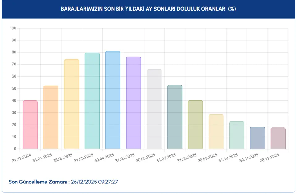 İSKİ tarafından 26.12.2025 tarihinde saat 09.27'de paylaşılan verilere göre, İSKİ ortalama baraj doluluk oranı %17.81