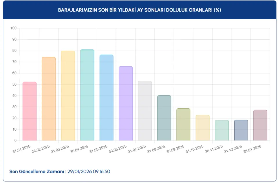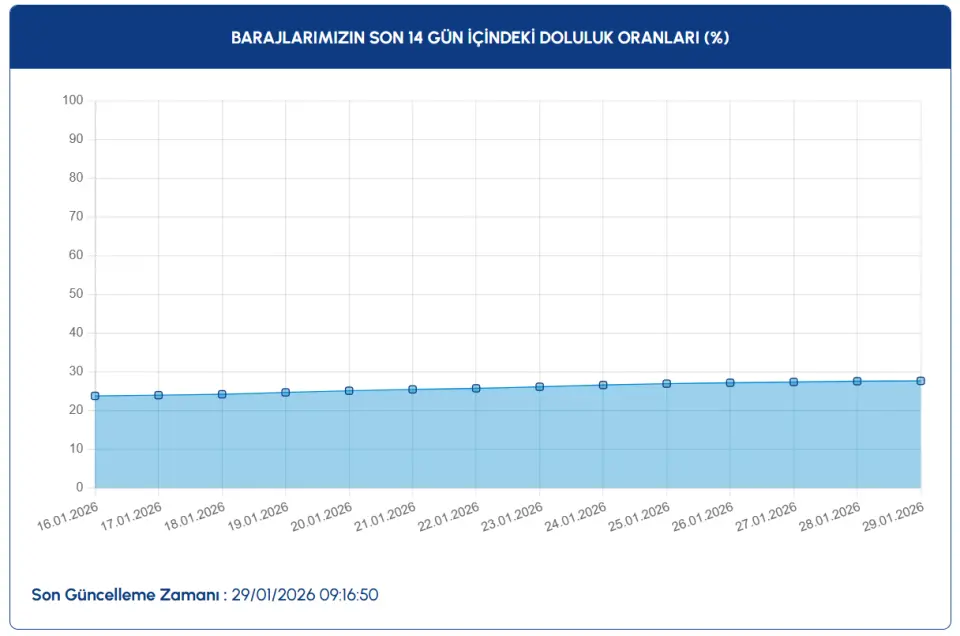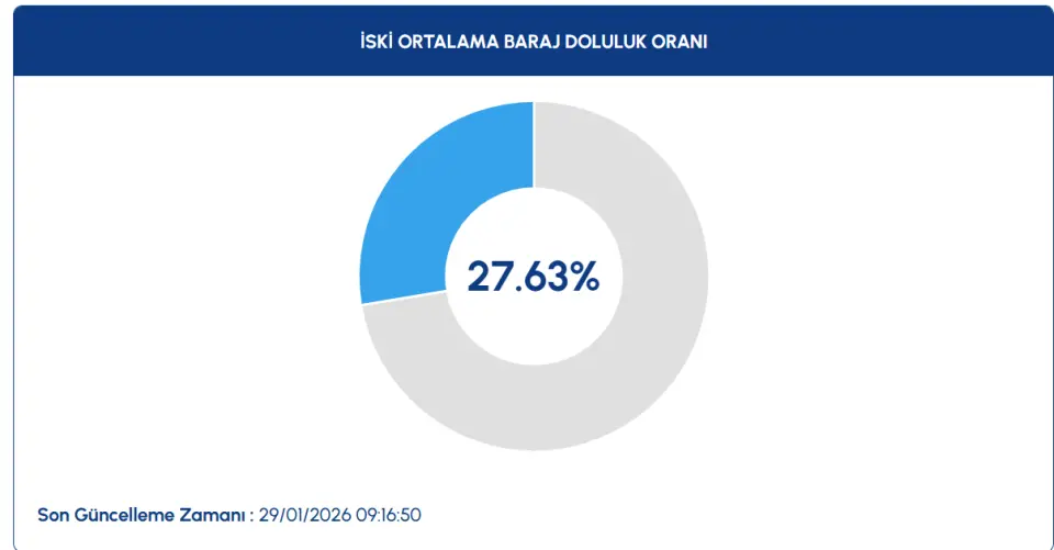 Böylece 29 Ocak 2026 tarihinde İstanbul Su ve Kanalizasyon İdaresi (İSKİ) tarafından açıklanan verilere göre ortalama baraj doluluk oranı %27.63 olarak açıklandı.