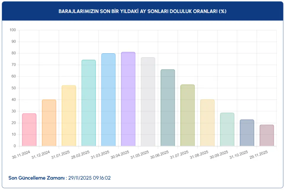 Böylece 30 Kasım 2025 tarihinde İstanbul Su ve Kanalizasyon İdaresi (İSKİ) tarafından açıklanan verilere göre ortalama baraj doluluk oranı %18,38 olarak açıklandı.