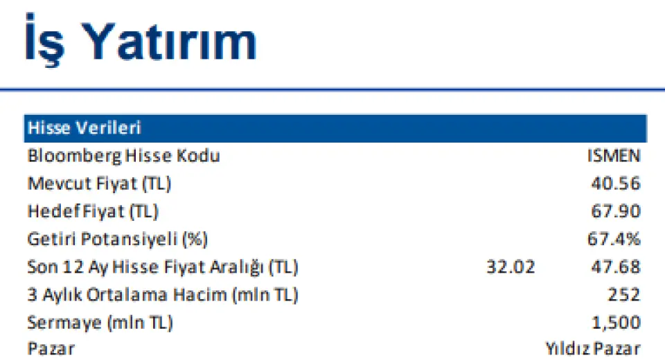 o İş Yatırım, 2025 yılında %8 negatif nominal performans sergilerken, BIST 100 endeksinin de %20 gerisinde performans göstermiştir. ISMEN, son 12 aylık verilere göre 8,8x F/K ve 2,1x PD/DD çarpanları ile işlem görmektedir. İş Yatırım için hedefi fiyatımızı 64,40 TL’den 67,90 TL’ye revize ediyor ve önerimizi AL yönünde sürdürürken, Döngüsel Portföyümüzde tutmaya devam ediyoruz.