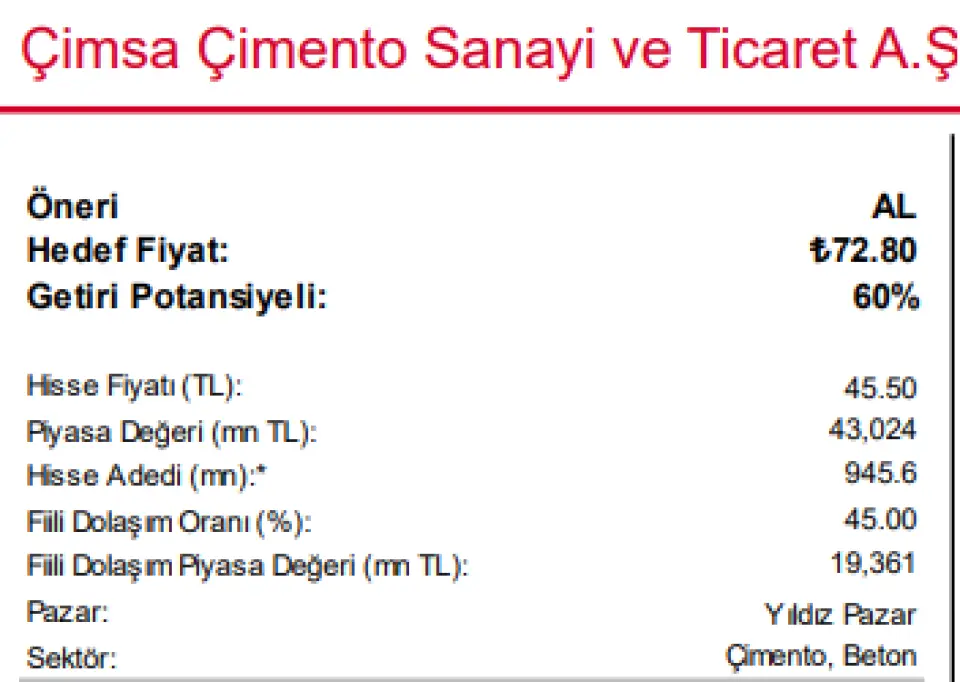 45 Liralık Çimento Hissesine 72,80 TL Hedef Fiyat