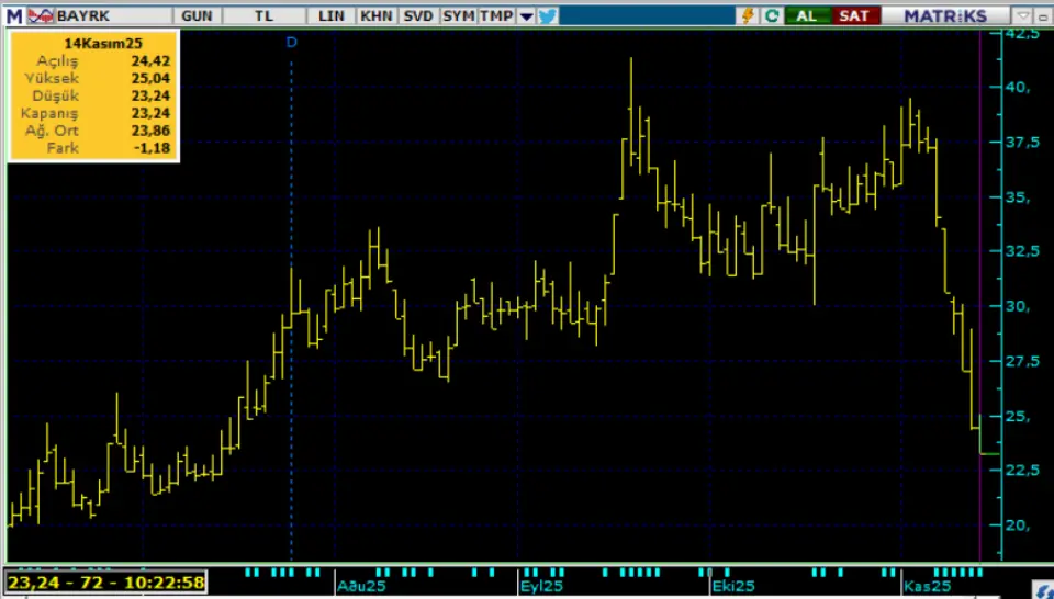 BAYRK 5 gündür taban taban gidiyor. Hisse 7 Kasım günü 37,66 TL fiyattan düşüşe geçti. Taban taban devam eden hisse, Mayıs ayı fiyatı olan 23,20 Liraya kadar düştü. Hissede yatırımcılar 5 günde %40 oranında kayıp yaşadı. Hissede bugün kayıp %5 den fazla olduğu için işlem sırası durduruldu.