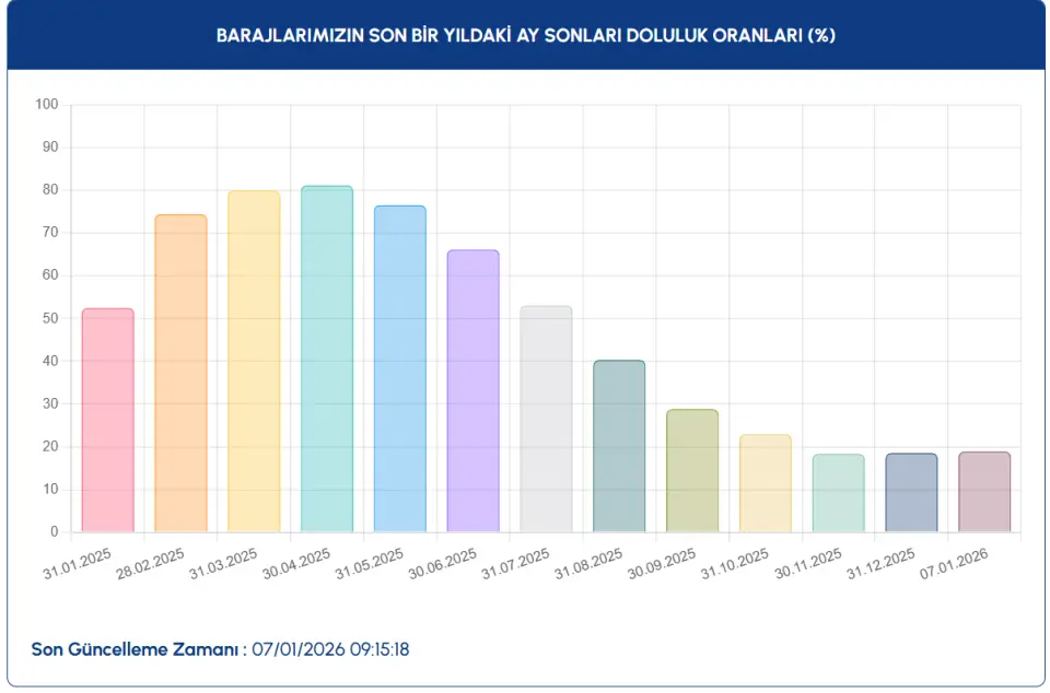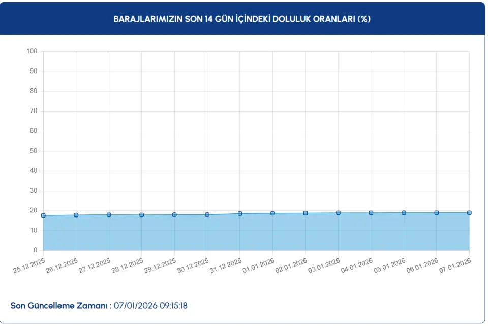 Böylece 7 Ocak 2026 tarihinde İstanbul Su ve Kanalizasyon İdaresi (İSKİ) tarafından açıklanan verilere göre ortalama baraj doluluk oranı %18.9 olarak açıklandı.