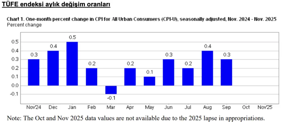 Bloomberg’e göre manşet TÜFE’de aylık bazda ortalama %0.3 artış bekleniyor. (beklenti aralığı: %0.1 - %+0.5) ABD’de hükümetin kapanması nedeniyle Ekim ve Kasım ayında aylık verilerin yayınlanmadığını not edelim. Yıllık artışın %2.7 ile yatay seyretmesi bekleniyor. (Kasım:%2.7)