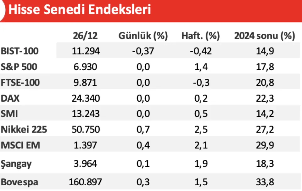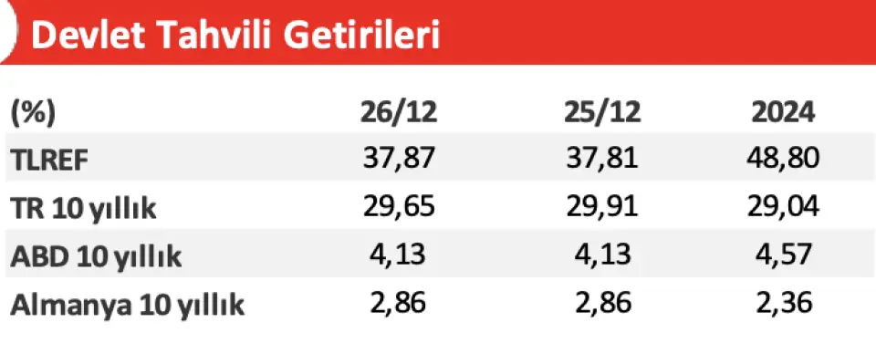 Avrupa vadeli işlemler piyasası bugün tam işlem gününe geri dönecek bölge borsalarında pozitif açılışa işaret ediyor. Yeni günde Asya tarafında, Japonya (Nikkei 225: %-0,39) haricinde genele yayılan satıcılı seyir takip edilirken, Güney Kore (KOSPI: %1,81) borsası yılın son günlerinde de teknoloji endeksi öncülüğünde en yüksek kazançla ön plana çıkıyor. Faizler tarafında, geçtiğimiz hafta ABD büyüme verisi haricinde veri takvimindeki sakinliğin ve Noel tatili nedeniyle hacimlerdeki düşüşün etkisiyle tahvil piyasaları da yatay seyir izledi. Bu sabah itibarıyla Fed'in nisan ayında faiz indirimine atfedilen olasılık %82 seviyesinde fiyatlanırken, Trump'ın yeni yılın ilk günlerinde açıklayacağı yeni Fed Başkanının Ulusal Ekonomi Konseyi direktörü Hassett olması bekleniyor.