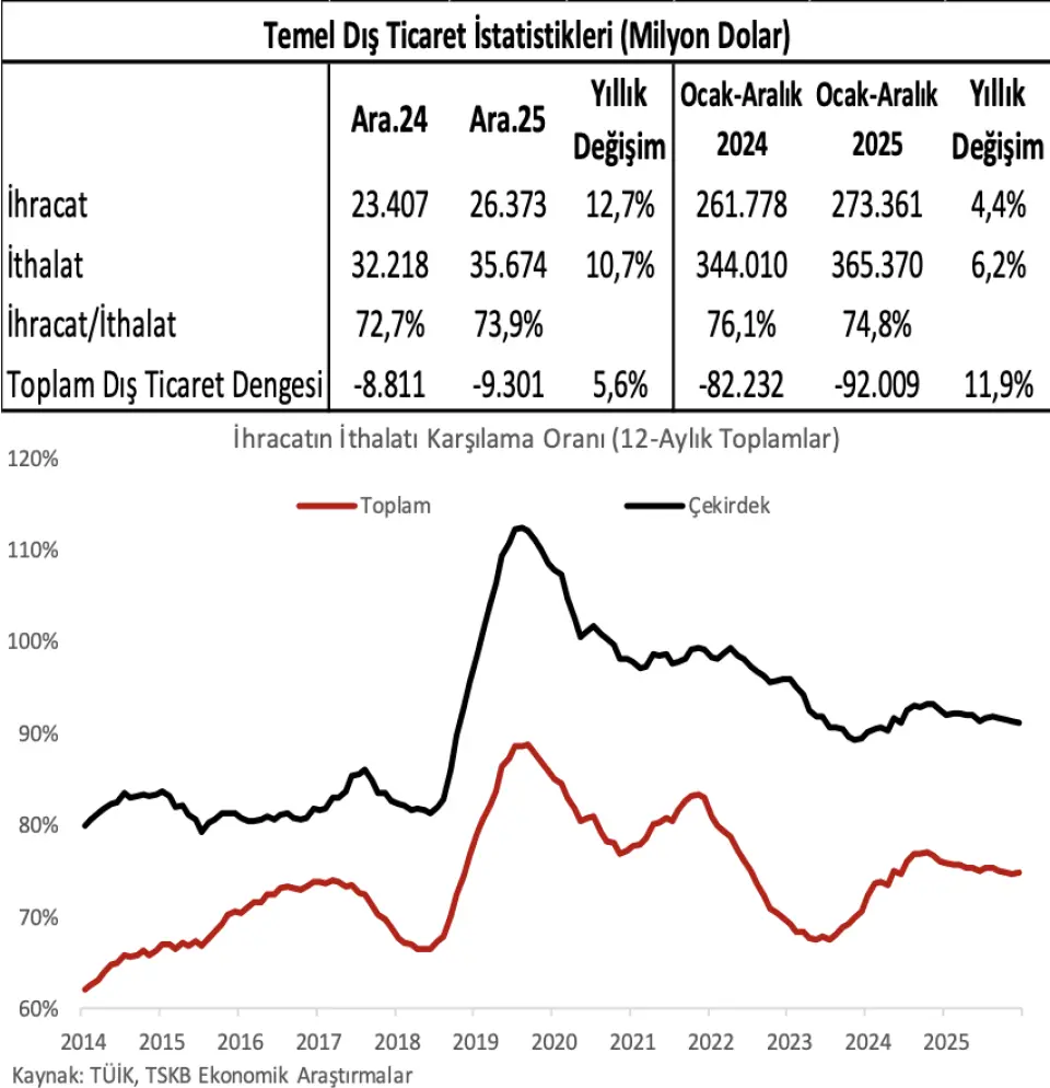 İhracatın ithalatı karşılama oranı Aralık'ta bir önceki yıla göre artsa da, dış ticaret açığı genişledi. İhracatın ithalatı karşılama oranı bir önceki yılın aynı ayındaki %72,7 seviyesinden %73,9'a çıktı. Buna karşın, dış ticaret açığı 8,8 milyar dolardan 9,3 milyar dolara yükseldi. Yıllık bazda altın ve enerji ürünleri hariç çekirdek ihracat %14,6, çekirdek ithalat da %17,9 genişledi. 2024 Aralık'ta yaklaşık 1,7 milyar dolar olan altın ve enerji hariç çekirdek dış ticaret açığı 2025'in aynı ayında 2,7 milyar dolara yükseldi.