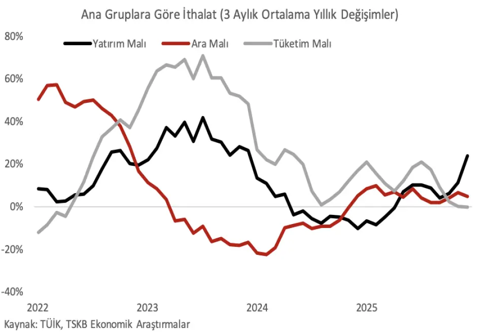 Aralık'ta yatırım malı ithalatındaki güçlü seyir sürdü. Yatırım ve ara malı ithalatı Aralık'ta yıllık bazda sırasıyla %38,7 ve %5,6 yükseldi. Binek otomobil ithalatı %28,7 artış ile yükselişini sürdürürken, toplamda tüketim malı ithalatı iki aylık daralmanın ardından yıllık bazda %6,7 artış kaydetti. Üç aylık ortalamalara bakıldığında ise son beş aydır tüketim malı ithalatının yavaşladığı görülüyor. Dayanıklı ve yarı dayanıklı tüketim malları ithalatı yıllık bazda sırasıyla %42,1 ve %0,9 gerilerken, dayanıksız tüketim mallarında %26,9 artış görüldü.