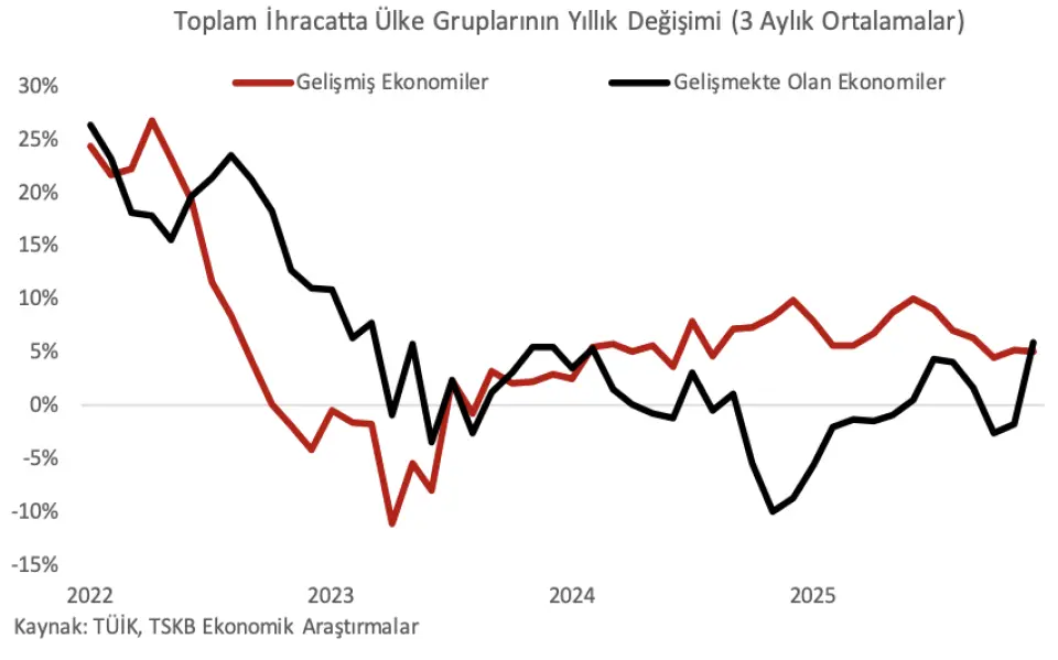 Bu dönemde ihracatta ana pazarların genelinde yıllık bazda artış gerçekleşti. AB ülkelerine yapılan ihracat, Aralık'ta euro/dolar paritesinin de desteğiyle yıllık bazda %8,3 yükselirken, AB dışındaki diğer Avrupa ülkelerine yapılan ihracat da %8,4 genişledi. Yakın ve Orta Doğu, diğer Asya ülkeleri ve Kuzey Afrika'ya yapılan ihracat sırasıyla %14,3, %24,0 ve %7,0 artış gösterdi. ABD tarafından Türkiye'ye uygulanan gümrük vergilerinin ortalamada efektif tarife oranlarının üzerinde kalmasına rağmen Kuzey Amerika'ya yapılan ihracatta da %4,9 genişleme görüldü. Görece küçük diğer pazarların genelinde de pozitif bir tablo vardı. Bu sonuçlarla gelişmiş ekonomilerin toplamına yapılan ihracat yıllık bazda %8,2, gelişmekte olan ekonomilerin toplamına yapılan ihracat da %17,8 yükseldi.