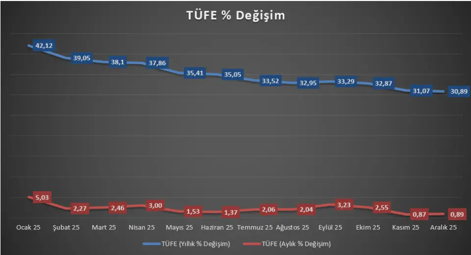 Kasım ayında aylık enflasyonun beklentilerin altında gerçekleşmesiyle birlikte yıllık enflasyonun %31 seviyelerine gerilemesi, dezenflasyon sürecinin devam ettiğine işaret etti. Aralık ayına ilişkin gerçekleşmelerin de piyasa medyan tahminlerinin hafif altında kalarak aylık %0,89, yıllık %30,89 seviyesinde oluşması, yıl sonu enflasyonunun TCMB’nin Enflasyon Raporu’nda öngördüğü %31–33 aralığıyla uyumlu bir noktada tamamlandığını gösteriyor. Bu tablo, 2025’in para politikası açısından hedeflere yakın bir kapanış yaptığını ve enflasyon görünümünde belirgin bir bozulma olmadığını ortaya koyuyor.