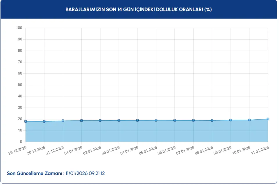 İSKİ tarafından 11.01.2026 tarihinde saat 09.21'de paylaşılan verilere göre, İSKİ ortalama baraj doluluk oranı %20.11