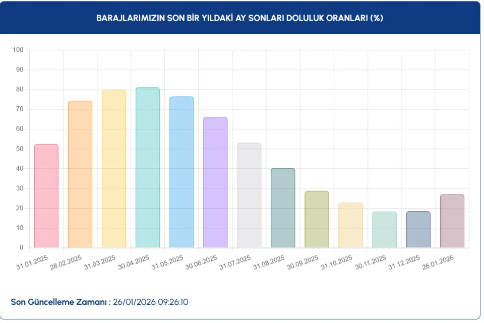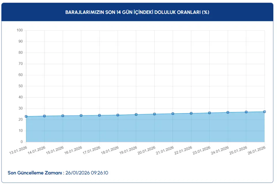 Böylece 26 Ocak 2026 tarihinde İstanbul Su ve Kanalizasyon İdaresi (İSKİ) tarafından açıklanan verilere göre ortalama baraj doluluk oranı %27.14 olarak açıklandı.