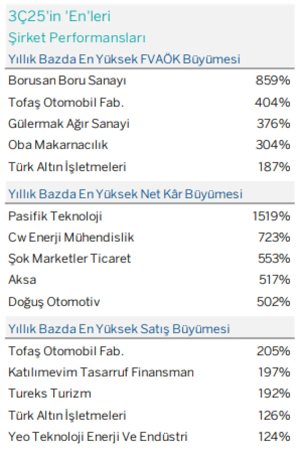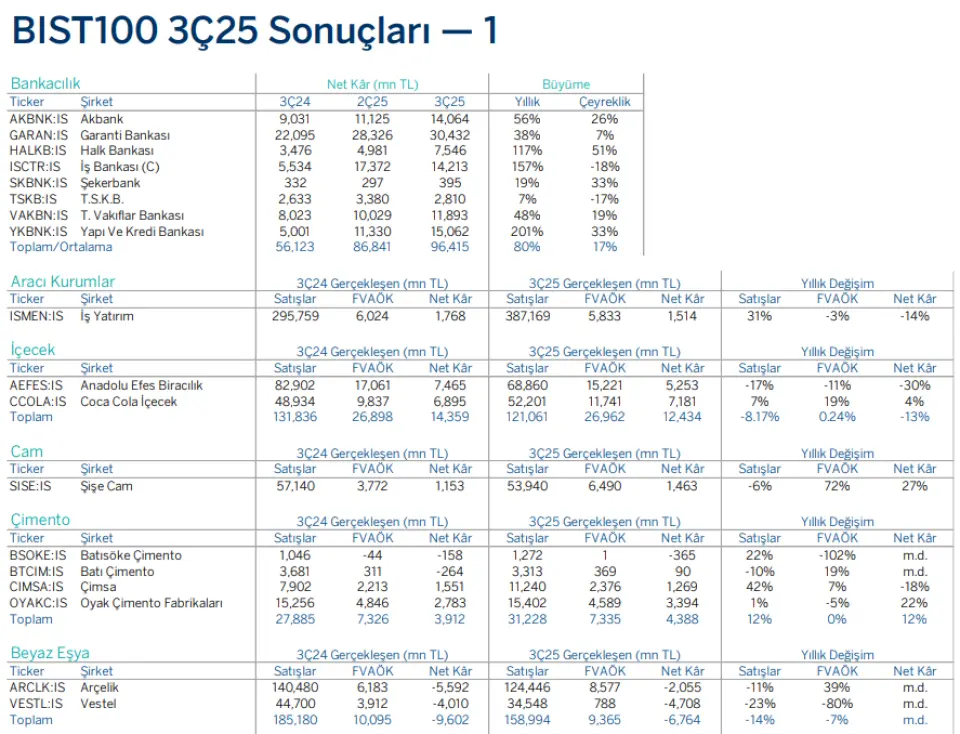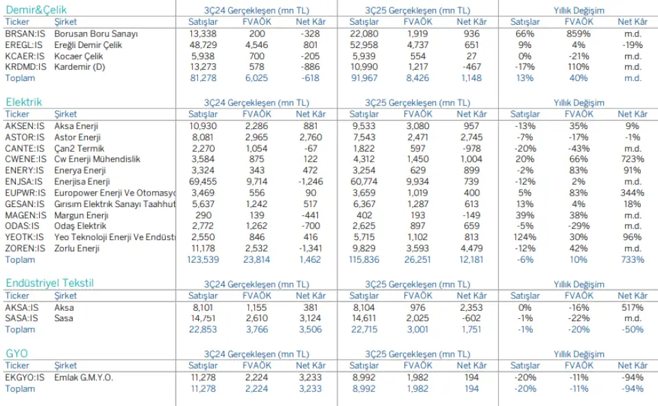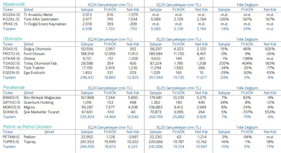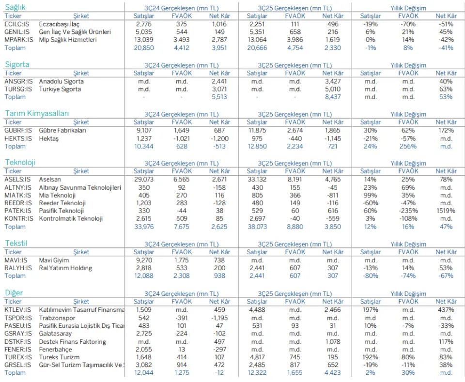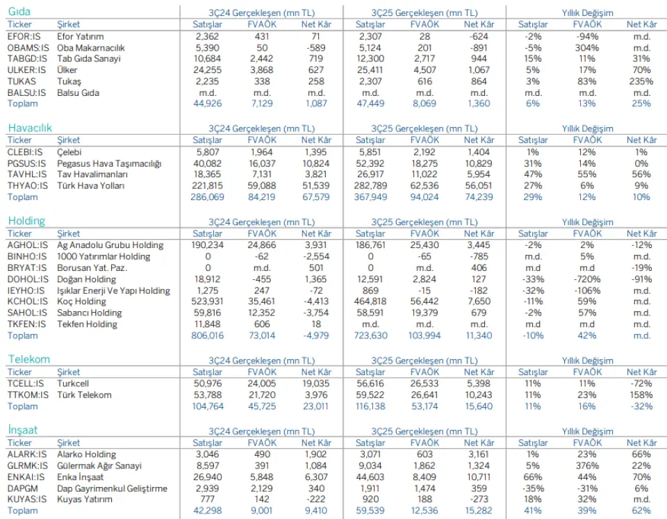 BIST100’de bu çeyrekte 19 şirket zarar açıkladı. Önceki çeyrekte bu rakam 25 iken, geçtiğimiz yıl aynı dönemde 28 şirket zarar açıklamıştı. Finans dışı şirketlerin bu çeyrekte toplam FVAÖK’ü %19, toplam net kârı ise %29 yıllık bazda büyüme sergiledi. 3Ç’de banka dışı şirketler beklentilerin genel olarak altında sonuçlar açıklarken, bankalar ise piyasa beklentilerini yendi. Bankalar piyasa beklentilerinin ortalamada %6 üzerinde net kar açıklarken, yıllık bazda kar büyümesi ise %80 seviyesinde gerçekleşti. Yüksek kar büyümesinin ana bileşenleri; i) gelişen kredi-mevduat makası, ii) yükselen TÜFE tahvil getirileri, iii) güçlü devam eden komisyon gelirleri ve enflasyona yakın faaliyet giderleri büyümesi ve iv) artan takip girişlerine rağmen, risk maliyetinin kontrol atında devam etmesi. Marj genişlemesinin 4Ç’de artarak devam etmesini ve bankaların karlılık performansının artmasını bekliyoruz. Marj tarafında tepe noktasının ise 3Ç26’da görülmesi şu anda en olası senaryo. Finans sektöründe elementer sigorta tarafı oldukça güçlü devam ediyor. Yıllık kar büyümesinin %53 olduğu sektör artan sigortacılık marjlarının yanı sıra, güçlü yatırım gelirleri ile karlılığını devam ettiriyor.
