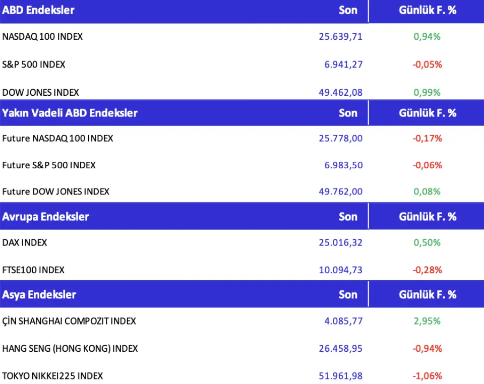 Küresel piyasalarda yeni yılın ilk günlerinde artan risk iştahı ABD borsalarını rekorlara taşıdı. Fed cephesinden gelen faiz indirimi mesajları ve beklentilerin altında kalan ABD Hizmetler PMI verisi, faiz indirimine yönelik beklentileri güçlendirdi. Bu ortamda S&P 500 yüzde 0,6, Nasdaq 100 ise yaklaşık yüzde 1 yükselirken, yapay zeka hisseleri öne çıktı. Piyasa, yıl sonuna kadar endekslerde çift haneli yükseliş potansiyelini korurken, ocak ayına özgü güçlü sermaye akışları da iyimserliği destekliyor. Altın yüzde 1, gümüş yaklaşık yüzde 6 değer kazanırken, Venezuela petrolüne ilişkin açıklamaların etkisiyle Brent petrol 60 dolara geriledi; ABD tahvil getirileri ve dolar ise sınırlı yükseldi.
