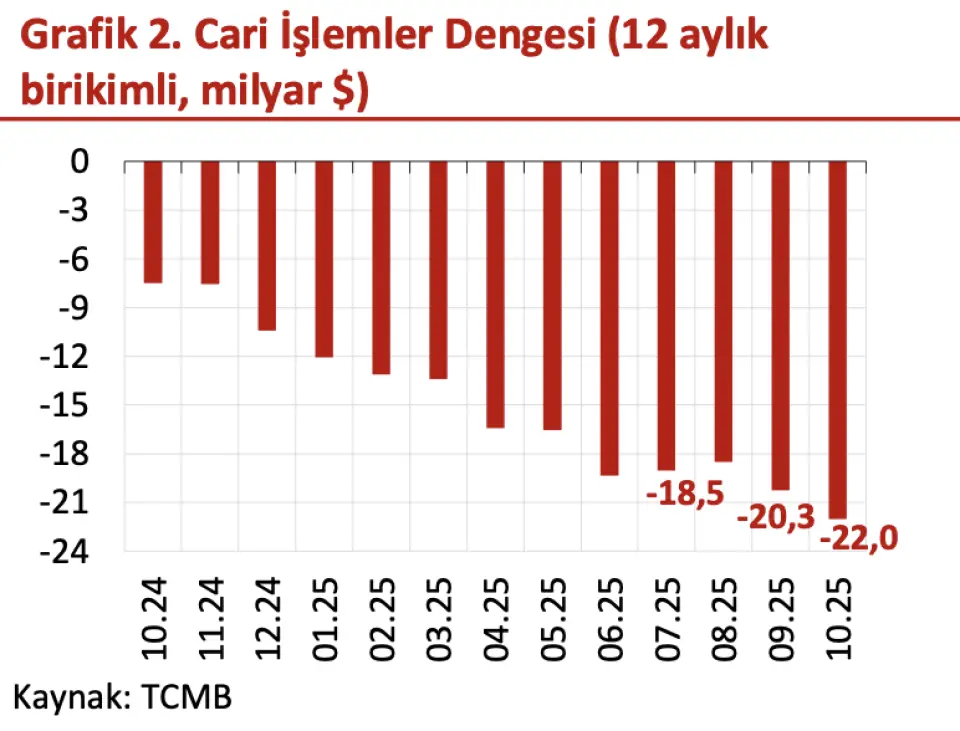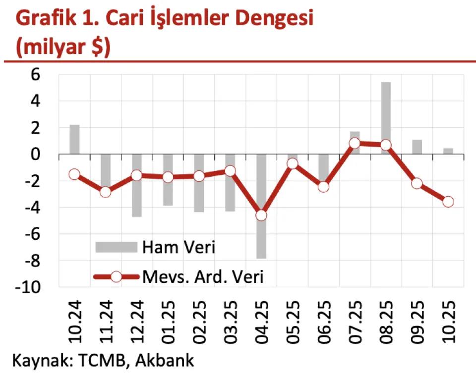 "Cari dengede kasım ayı ile birlikte hizmetlerin mevsimsel etkisinin zayıflaması ve enerji ithalatının mevsimsel etkilerle artmasıyla açık verdiği döneme giriyoruz. Kasım ayında cari açığın 2,5 milyar $ civarında olacağını tahmin ediyoruz. Cari dengede temmuz ve ağustos aylarında oldukça olumlu bir seyir izlenmişti. Ancak eylül ve ekim aylarında hızlı bir bozulma gerçekleşti.