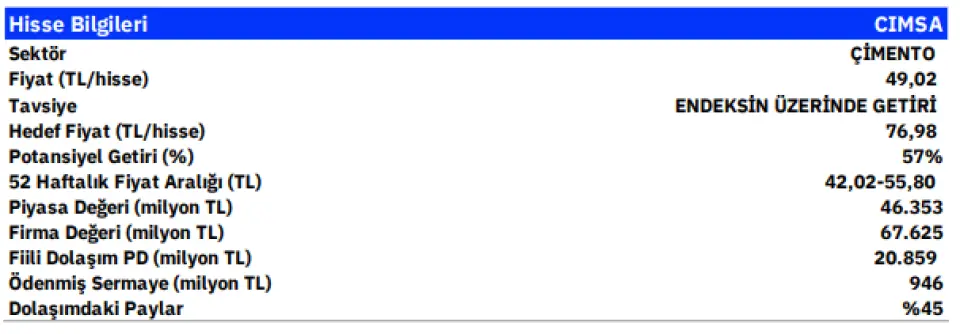 Gedik Yatırım CIMSA için hedef fiyat raporu yayınlayarak hisseden %57 getiri beklediğini açıkladı. Kurum hisseye 76,98 TL hedef fiyat verdi ve endeks üzeri getiri beklediğini açıkladı.