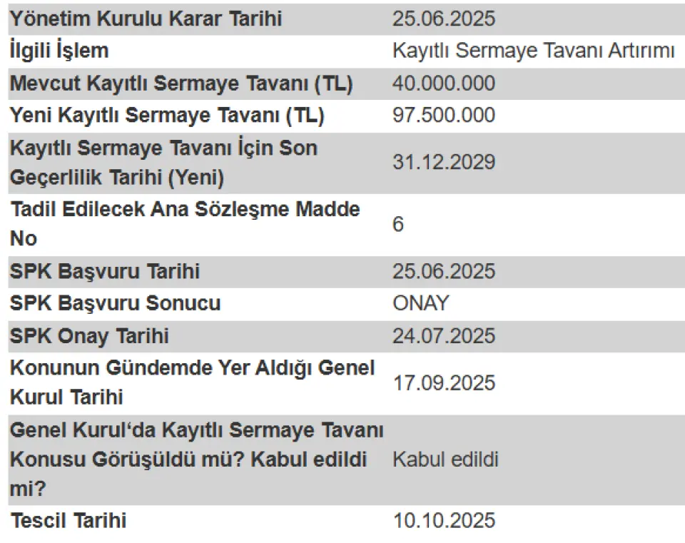 Şirketimiz'in 40.000.000,-Türk Lirası olan Kayıtlı Sermaye Tavanı'nın 97.500.000,-Türk Lirası'na çıkarılmasına ve süresinin 2029 yılı dahil olmak üzere 5 (beş) yıl daha uzatılmasına, bu kapsamda; Esas Sözleşme'nin 6'ncı maddesinin tadil edilmesine ilişkin talebimiz T.C. Ticaret Bakanlığının 08.08.2025 tarihli yazısı ile onaylanmıştır.