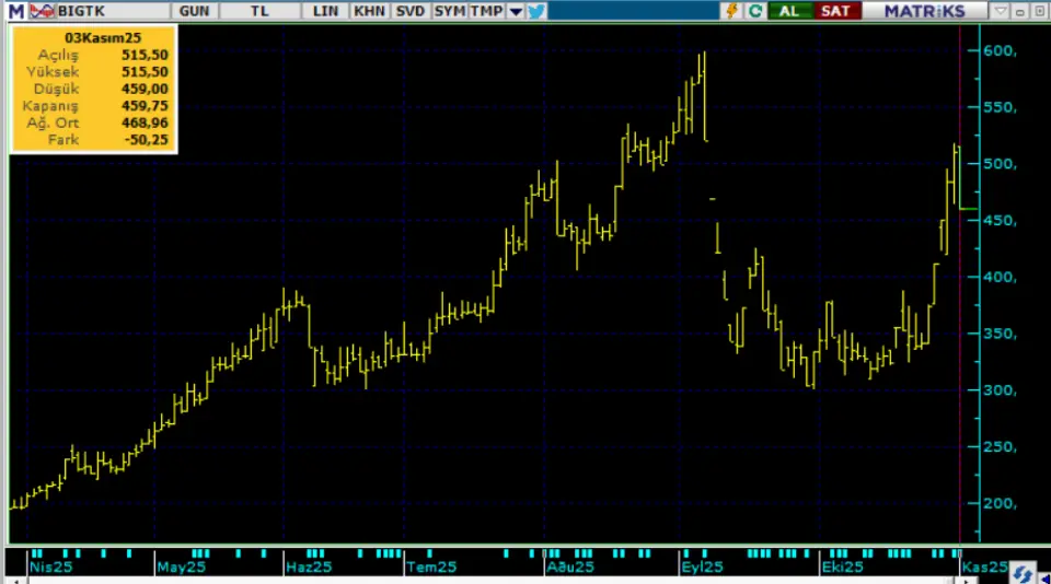 BIGTK Mart ayında yükselen trende başlamıştı. Hisse, 180 TL fiyattan 5 ayda 598,50 TL zirve fiyata kadar primlendi. Eylül başında görülen bu zirve fiyattan düzeltme satışları alan hisse bu günlerde 500 TL destek noktasında işlem görüyor.